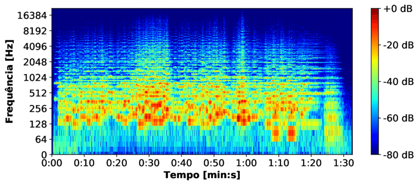 Los formatos FLAC y WAV representan la máxima fidelidad en audio, ya que son sin pérdida. Su espectro de frecuencias supera los 22 kHz y mantiene todos los matices originales de la grabación, sin recortes ni compresiones perceptibles. A continuación podrás ver un espectrograma de ejemplo, donde se nota claramente la amplitud completa del rango de frecuencias y la riqueza sonora que ofrecen estos formatos.