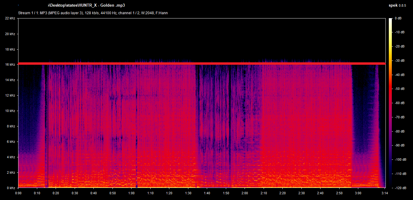 El audio en MP3 a 128 kbps se reconoce porque su rango de frecuencias llega solo hasta los 16 kHz. Esto provoca que los sonidos agudos pierdan claridad y la calidad general se sienta más comprimida. A continuación podrás ver un ejemplo visual en espectrograma, donde se aprecia claramente cómo se limita la información del audio en esta calidad.