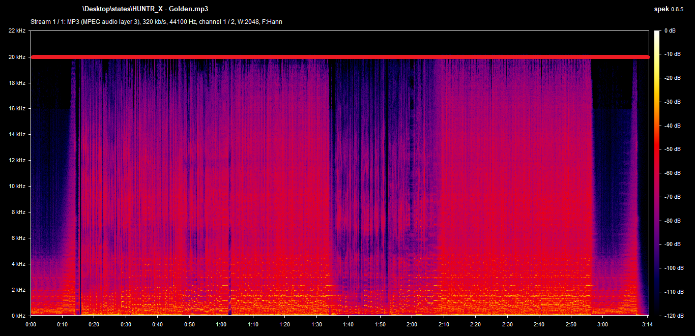 El audio en MP3 a 320 kbps ofrece una calidad mucho más cercana al original. Su rango de frecuencias alcanza hasta los 20 kHz, permitiendo percibir mejor los agudos y un sonido más definido en comparación con los 128 kbps. A continuación verás un espectrograma de ejemplo, donde se aprecia cómo esta compresión conserva más información del audio y brinda una experiencia más nítida.